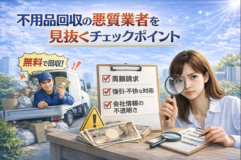 • 「一般廃棄物収集運搬業」の許可番号が確認できない: 家庭の不用品を回収するには市区町村の正式な免許が必要です(※用語名とは:一般廃棄物収集運搬業許可。産業廃棄物の許可とは異なり、家庭ゴミを扱うために必須の法的資格です)。